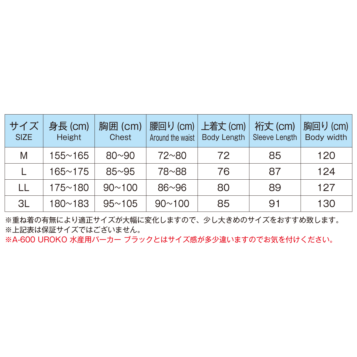 ※A-600 UROKO 水産用パーカー ブラックとはサイズ感が多少違いますのでお気を付けください。